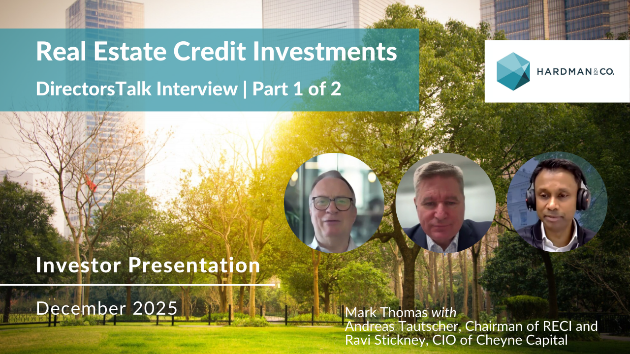 Real Estate Credit Investments (RECI) is taking advantage of elevated returns in the less competitive sub-sectors of European real estate debt while maintaining a measured approach to risk. In the first of two investor webinars hosted by Hardman & Co’s Mark Thomas, RECI’s Chairman Andreas Tautscher and Cheyne Capital’s Ravi Stickney (RECI’s manager) outlined how the fund delivers a 10.6% weighted average yield by focusing on senior secured loans backed by UK and European property. With £390.1m in gross assets, RECI is actively redeploying repayments into a healthy pipeline of new opportunities across sectors such as logistics, hospitality, and healthcare, supported by prudent LTVs. The discussion also highlighted the fund’s rigorous risk management, comparatively modest 34% leverage ratio, and its clear stance on dividend sustainability and discount-to-NAV.