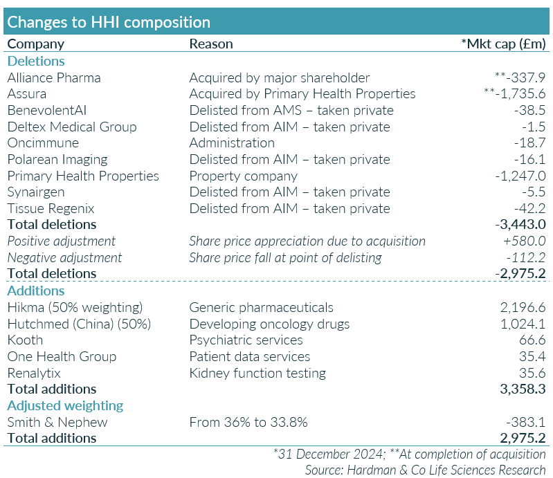 As seen in previous years, there have been some enforced changes to the composition of the HHI following a number of M&A transactions, delistings to become private again and, unfortunately, some companies going into administration. During 2025, there were five M&A deals completed, the largest being the acquisition of Assura Group (AGR.L) by Primary Health Properties (PHP.L) after a prolonged battle with a private equity group. We have taken this opportunity to replace PHP in our index, as it is essentially a property company rather than a healthcare company, albeit it does provide premises for healthcare providers. Moreover, we had some additional unexpected changes during the year, with 11 healthcare companies delisting – not all of these were included in our index – and becoming private again as a consequence of finding it difficult to raise new capital at sensible valuations, and two companies, unfortunately, going into administration. Overall, we have replaced nine companies with a combined market capitalisation of £2.86bn (at 31 Dec 2024; £3.44bn less the £0.56bn M&A appreciation by the date of completion), representing 14.5% of the index, as shown in the following table.